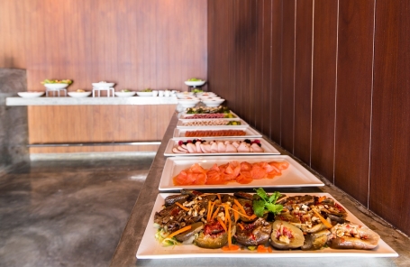 A spacious interior divided into a dining area, lounge and buffet counter area, and Elements Pool & Lounge offers the perfect ambience to unwind as you sip on your drink. A generous selection of cheese soft/firm, nutty, flavorful varieties & a variety of breads to go with the cheese spoils you utterly. Interesting appetizers including a range of salami cuts, salmon, exotic salads and the regular crunchy greens with tangy dressings.